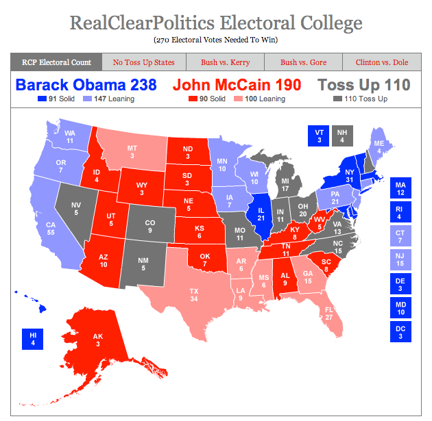 RealClearPolitics has a rundown on what the Electoral College map looks like at this point in the election season.