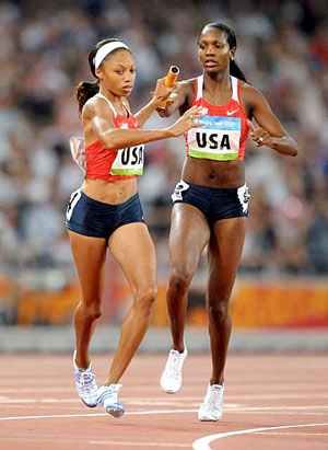 Allyson Felix takes a handoff from Mary Wineberg on the second leg of the Olympic women's 1,600 relay. The U.S. women won in 3:18.54.